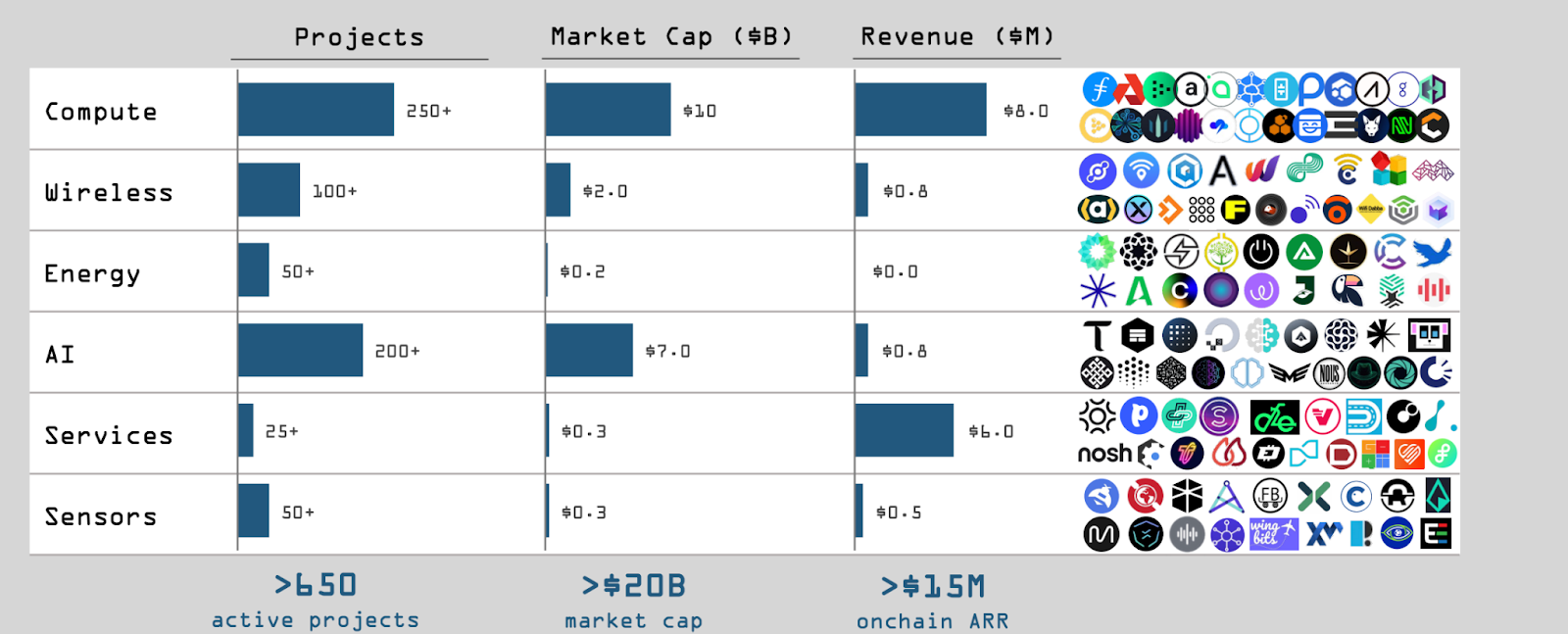 DePIN 项目的数量正在快速增长。根据 Messari 的报告,到 2023 年,该生态系统已经扩展到超过 650 个项目,涵盖了六个子领域:计算(250 个)、人工智能(200 个)、无线(100 个)、传感器(50 个)、能源(50 个)和服务(25 个)。