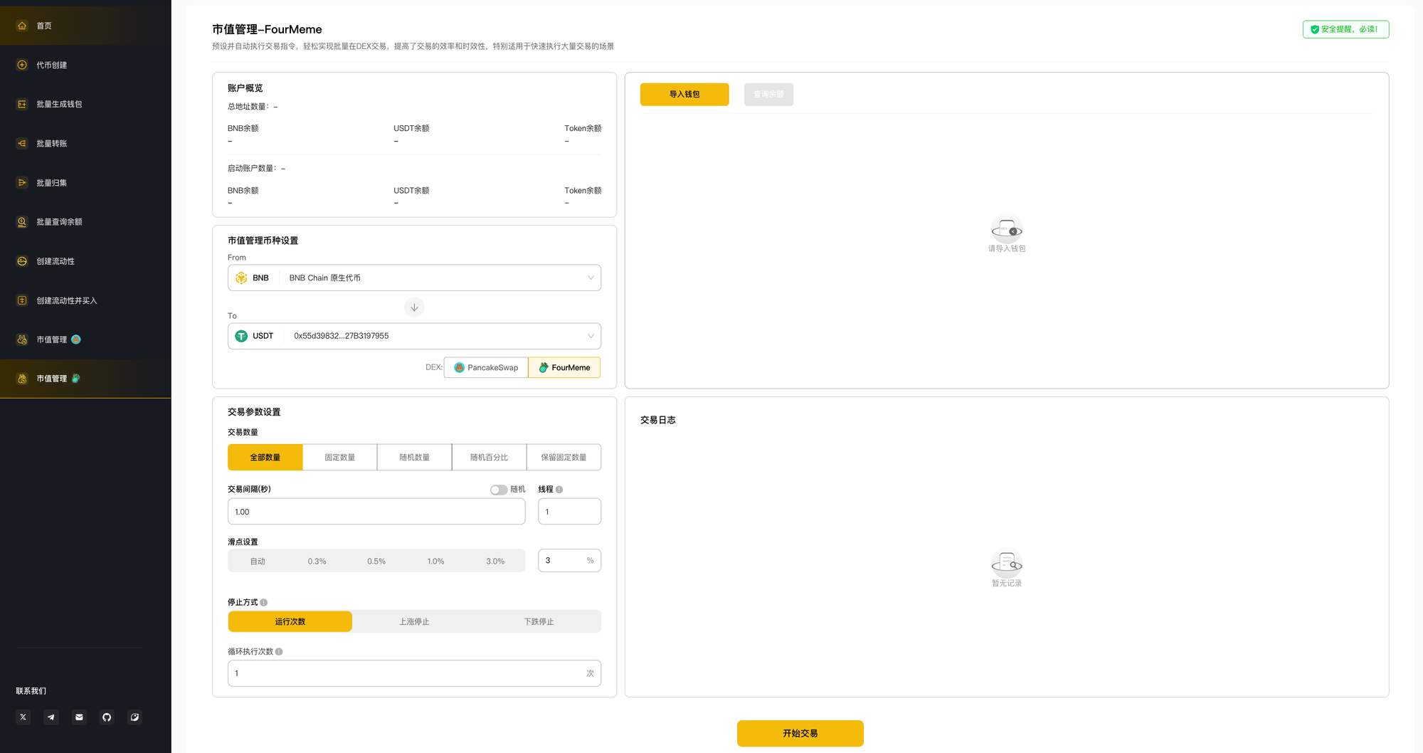 - 连接Four.meme:选择目标代币池,启动批量交易功能。