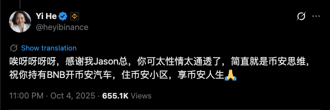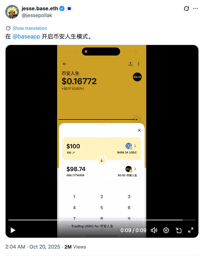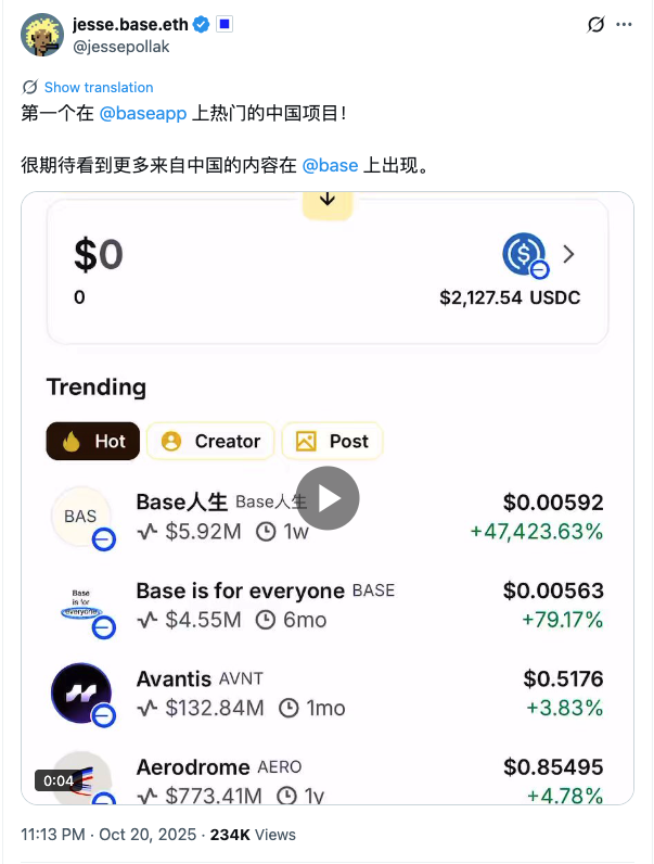 几乎在同一时间,Base 与 Solana 相继响应。Base 联创 Jesse Pollak 连续发布中文推文,欢迎中国用户并点名「Base 人生」,为叙事注入新的扩散通道。Base 链上的同名 Meme 代币在 24 小时内暴涨近 50 倍,形成对 BSC 的回应。