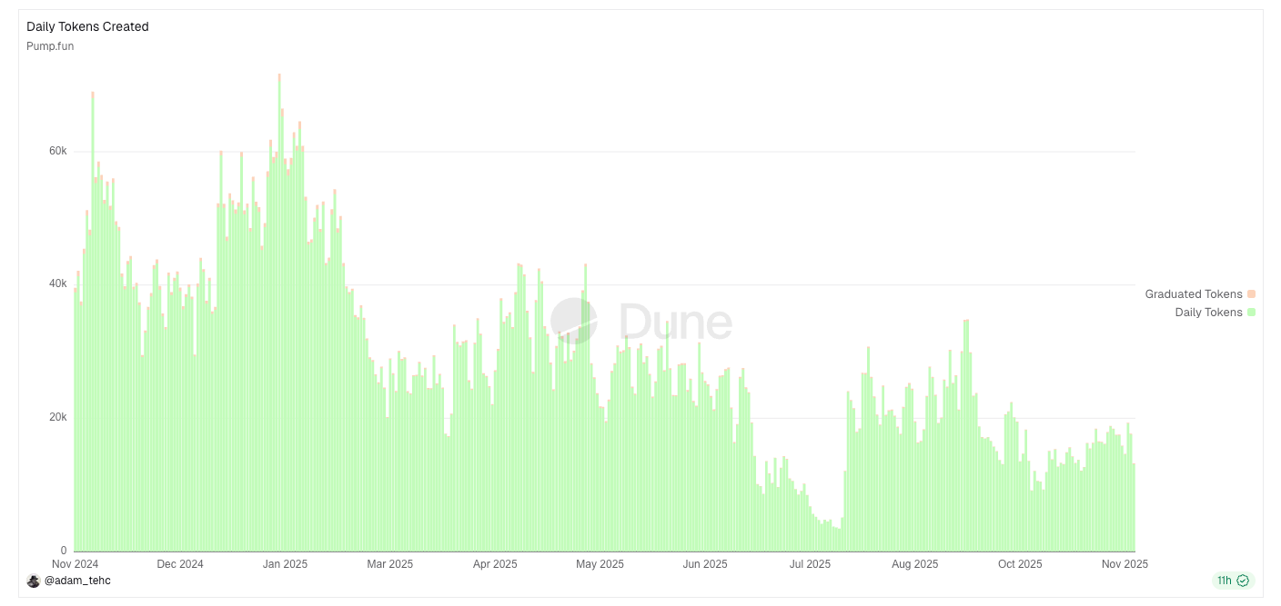 「截止发稿,Pump.fun 代币创建数量已不足峰值的三分之一。」