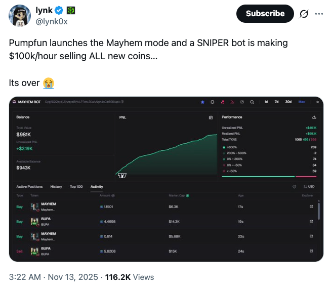 「Pumpfun 推出了混乱模式,一个狙击机器人每小时能赚 10 万美元,它出售了所有新发行的代币……」