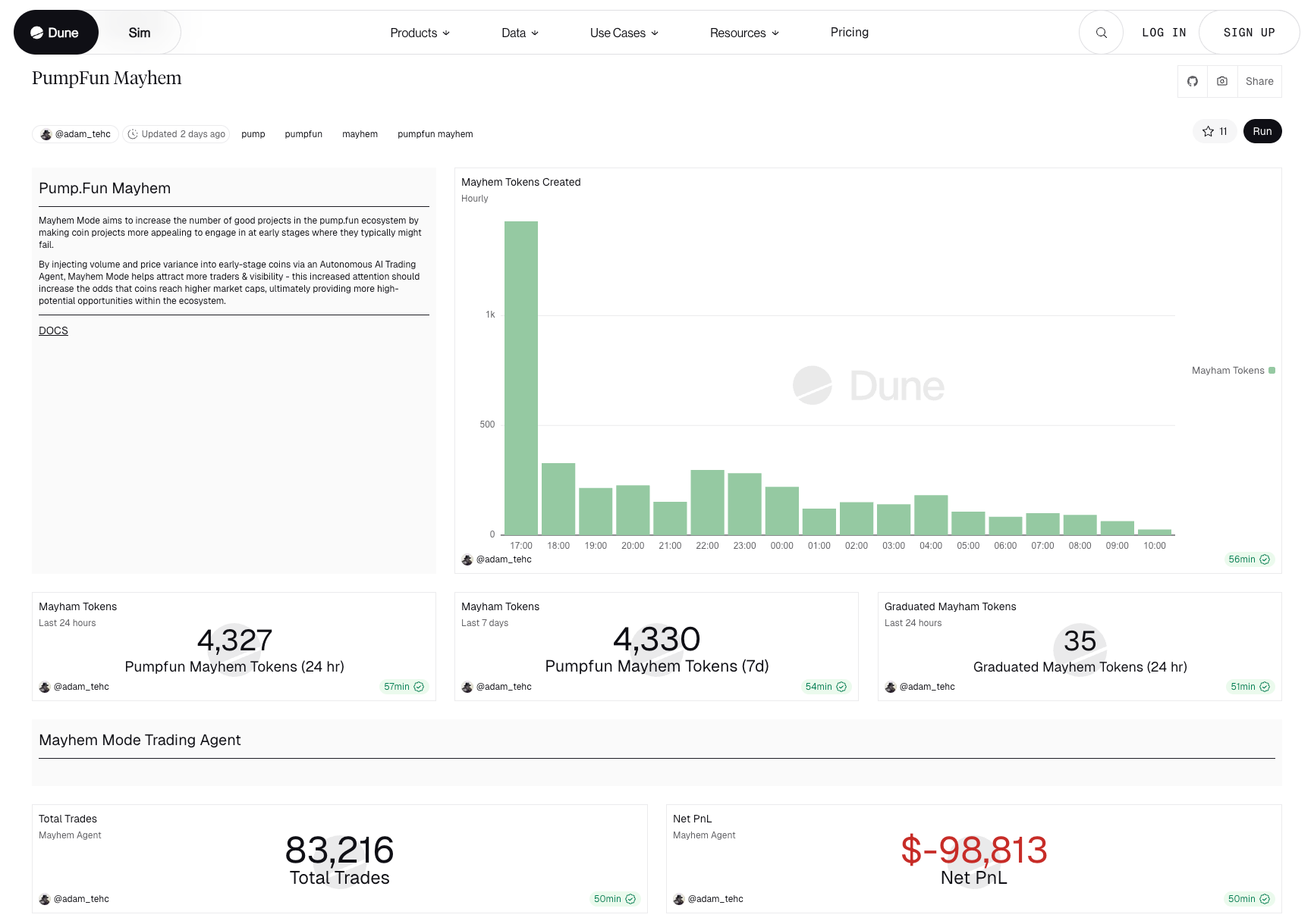 提供流动性支持这一点,传统的解决方案是聘请做市商,但这往往意味着项目方需要出让代币份额、支付高昂费用,甚至有一些不透明的暗箱操作。而从本质上看,「Mayhem mode」则是一个「免费的AI代理做市商」——通过完全自主交易来为新币提供早期流动性支持(尽管是以占据 50% 的筹码为代价),来帮助项目突破价格瓶颈。